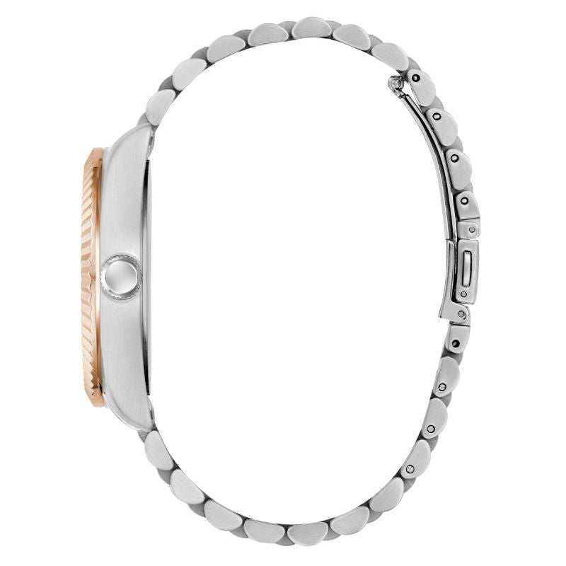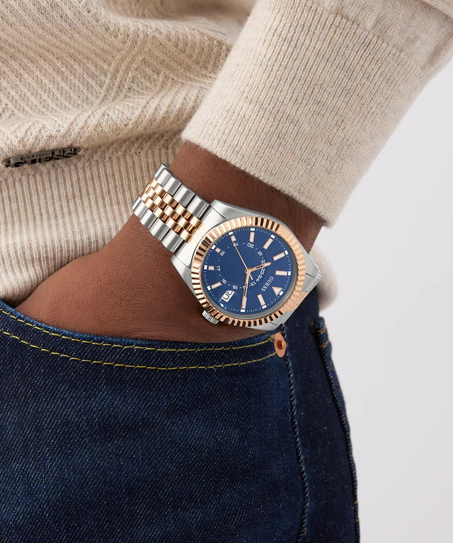¡Este look fresco y elegante ofrece una sofisticación atemporal! Cuenta con una caja de acero reciclado cepillado y pulido de 42 mm en dos tonos, plata y oro rosa, con brazalete estilo jubileo. La esfera azul con efecto rayos de sol incluye una ventana de fecha y una subesfera de 24 horas, y está enmarcada por un distintivo bisel con borde de moneda que unifica este hermoso reloj. Con protección de lente mineral, movimiento analógico de cuarzo preciso y resistencia al agua de 50 metros, este versátil reloj es perfecto para el hombre que exige estilo y calidad en su colección de relojes.rfecto para el hombre que exige estilo y sustancia en su colección de relojes.