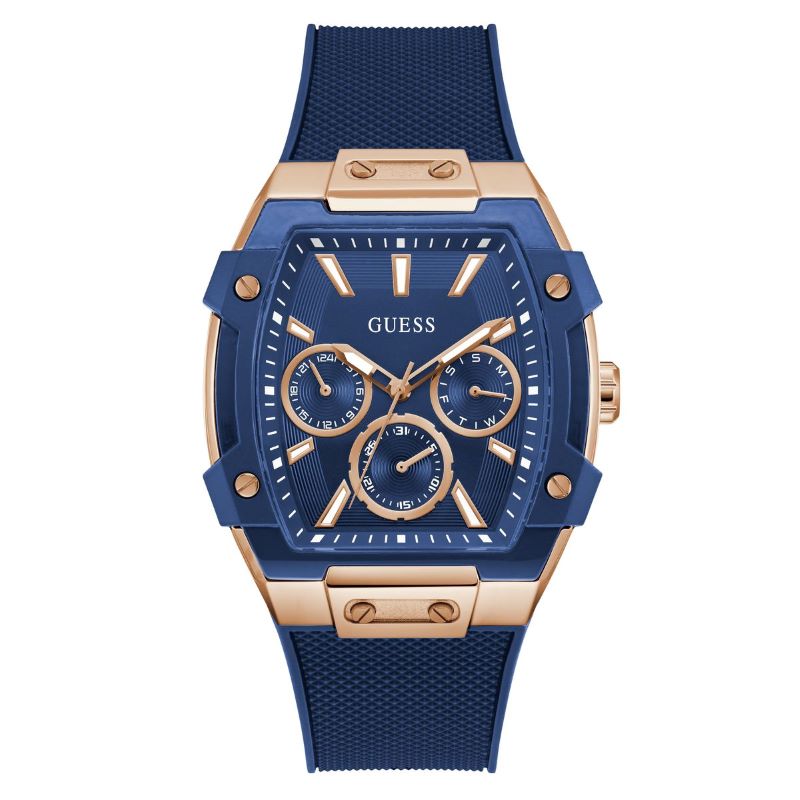 Desata tu estilo con esta pieza poderosa que presenta nuevos detalles innovadores de nailon y un diseño contemporáneo audaz, en una caja rectangular de 51 mm x 44 mm. Una caja de acero reciclado pulido en tono oro rosa se combina con una superposición de nailon azul de base biológica y se complementa con una correa de silicona azul texturizada. La esfera azul con efecto rayos de sol ofrece capacidades multifuncionales y, con una resistencia al agua de 50 metros, este reloj vanguardista es perfecto para el hombre que exige innovación y rendimiento en sus accesorios.