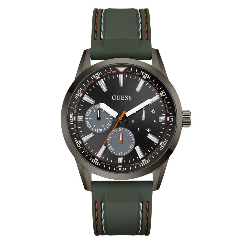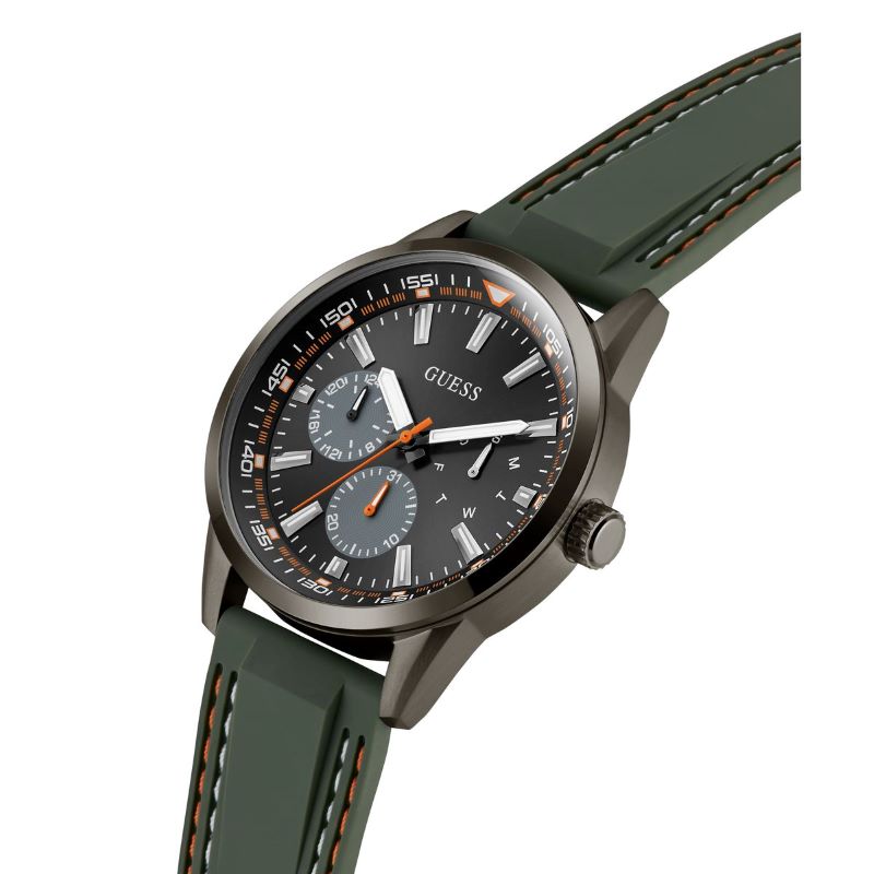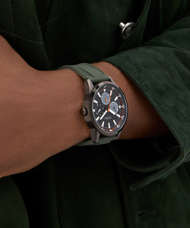 Este dinámico reloj deportivo combina colores llamativos con sofisticación, presentando una caja redonda de 44 mm en acero reciclado cepillado y pulido color plomo, junto con una correa de silicona verde alga marina con llamativas costuras en relieve. La esfera negra con efecto rayos de sol muestra capacidades multifuncionales y añade profundidad y dimensión a este diseño de inspiración atlética. Con una resistencia al agua de 50 metros, este llamativo reloj es perfecto para el hombre que necesita una sofisticación deportiva que siga su ritmo.