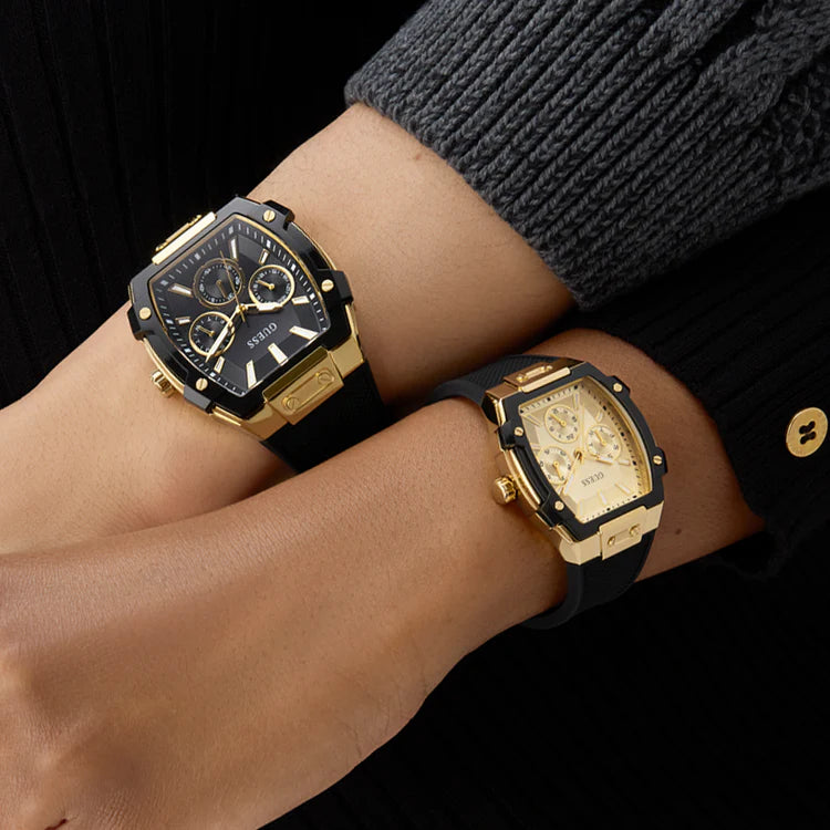 Desata tu estilo con esta pieza poderosa que presenta nuevos e innovadores detalles de nailon y un diseño contemporáneo audaz, en una caja rectangular de 51 mm x 44 mm. Una caja de acero reciclado pulido en tono dorado se combina con una superposición de nailon negro de base biológica y se complementa con una correa de silicona texturizada negra. La esfera negra con efecto rayos de sol ofrece capacidades multifuncionales y, con una resistencia al agua de 50 metros, este reloj vanguardista es perfecto para el hombre que exige innovación y rendimiento en sus accesorios.
