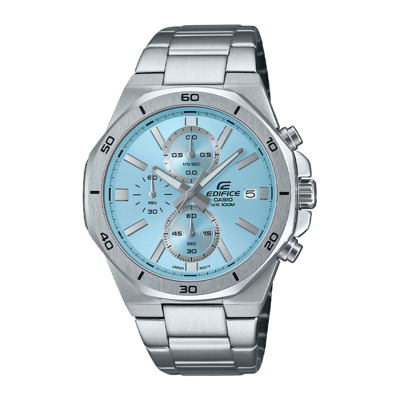 Lleva un clásico renovado con un toque de color, y disfruta de la combinación perfecta de sofisticación y simplicidad en este cronógrafo deportivo, diseñado para resistir hasta 10 bares de presión bajo el agua. El bisel octogonal presenta una superficie frontal plana pulida con un acabado fino, que contrasta elegantemente con sus laterales de acabado espejo. Este juego de texturas se complementa con una esfera en tonos suaves pero vibrantes, añadiendo un toque de estilo distintivo a tu muñeca.